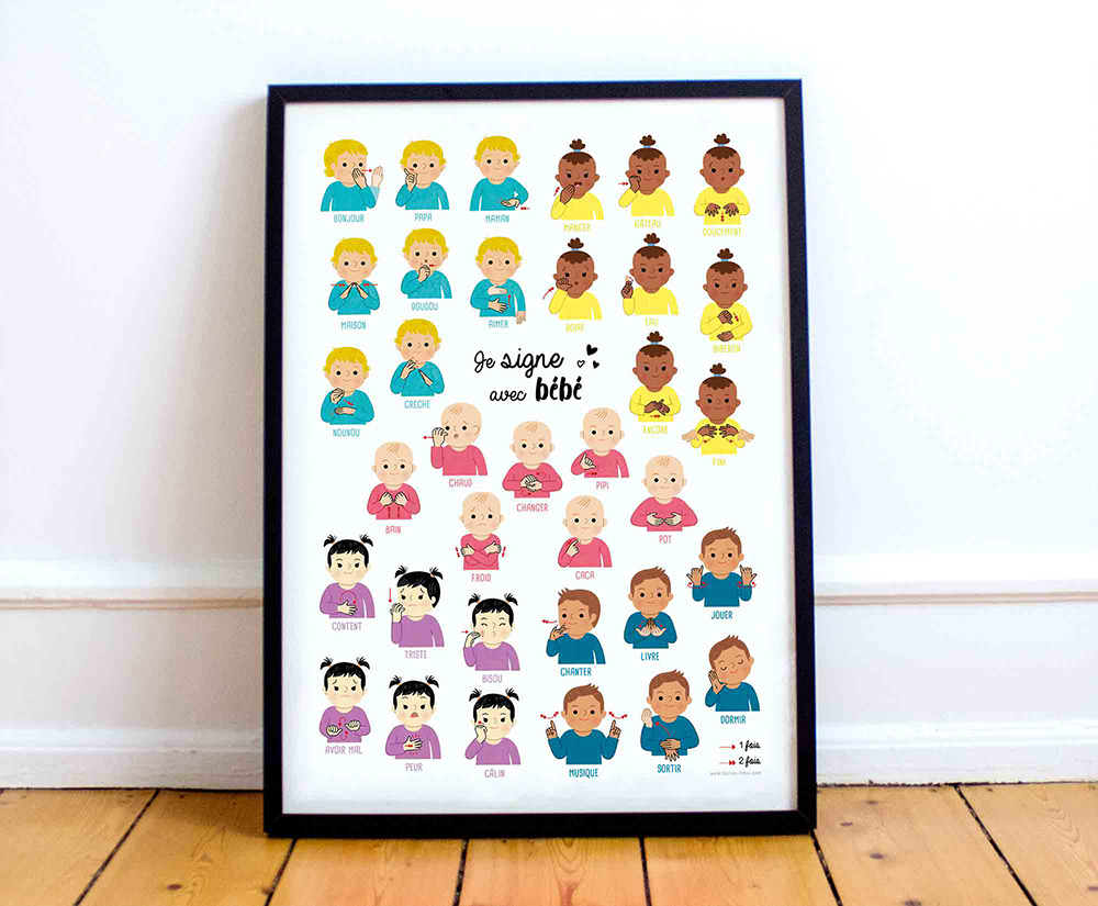 Cette affiche regroupe 35 premiers signes issus de la Langue des Signes Française, pour favoriser l’échange et la communication avec bébé.